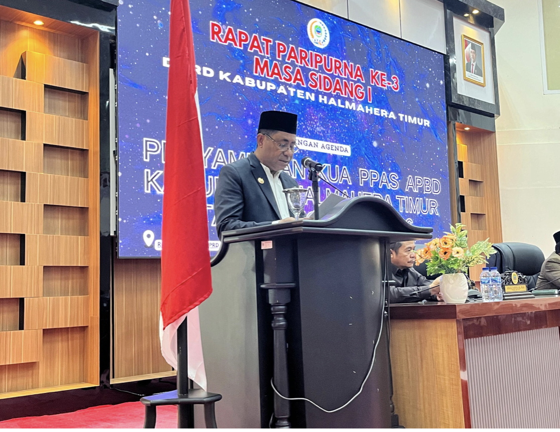 HALMAHERA TIMUR — Pemerintah Kabupaten Halmahera Timur (Haltim) mulai membahas arah kebijakan anggaran tahun 2026. Pembahasan itu ditandai dengan penyampaian Nota Pengantar Rancangan Kebijakan Umum Anggaran (KUA) dan Prioritas Plafon Anggaran Sementara (PPAS) oleh Bupati Halmahera Timur Ubaid Yakub dalam rapat paripurna DPRD Haltim, Kamis (23/10/2025).Rapat paripurna yang dipimpin Ketua DPRD Idrus E. Maneke ini turut dihadiri Wakil Bupati Anjas Taher, para pimpinan OPD, serta seluruh anggota DPRD Haltim.