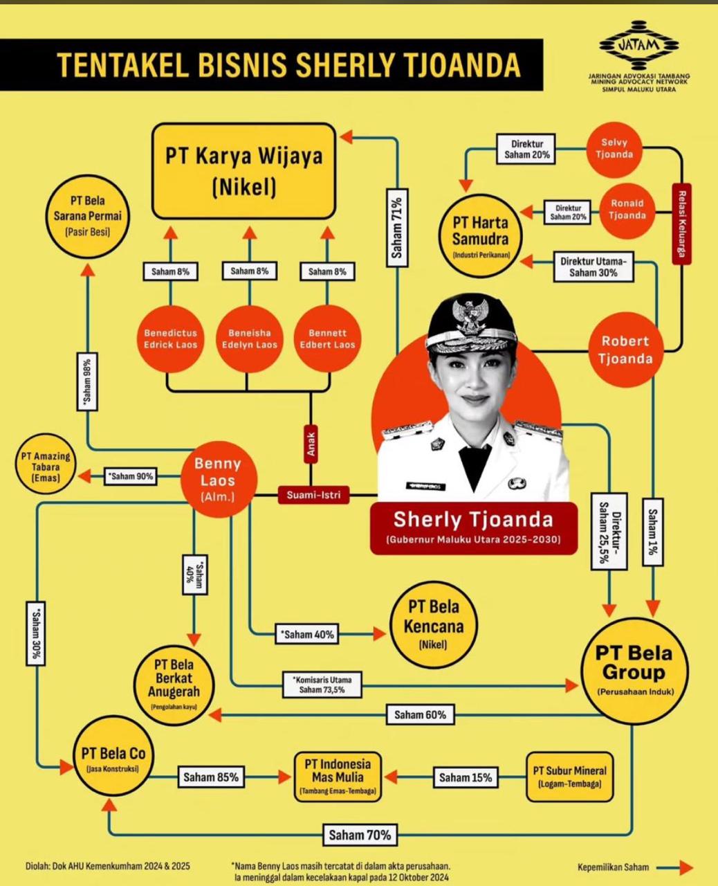 Menurut data yang dihimpun Malut Institute, Sherly Tjoanda tercatat sebagai pemilik dan pemegang saham mayoritas di lebih dari sepuluh perusahaan yang bergerak di sektor strategis, mulai dari tambang nikel, emas, tembaga, pasir besi, perkayuan, jasa konstruksi, hingga perhotelan. Dengan posisi tersebut, Sherly tidak hanya memiliki kendali finansial, tetapi juga otoritas penuh dalam menentukan arah kebijakan perusahaan.