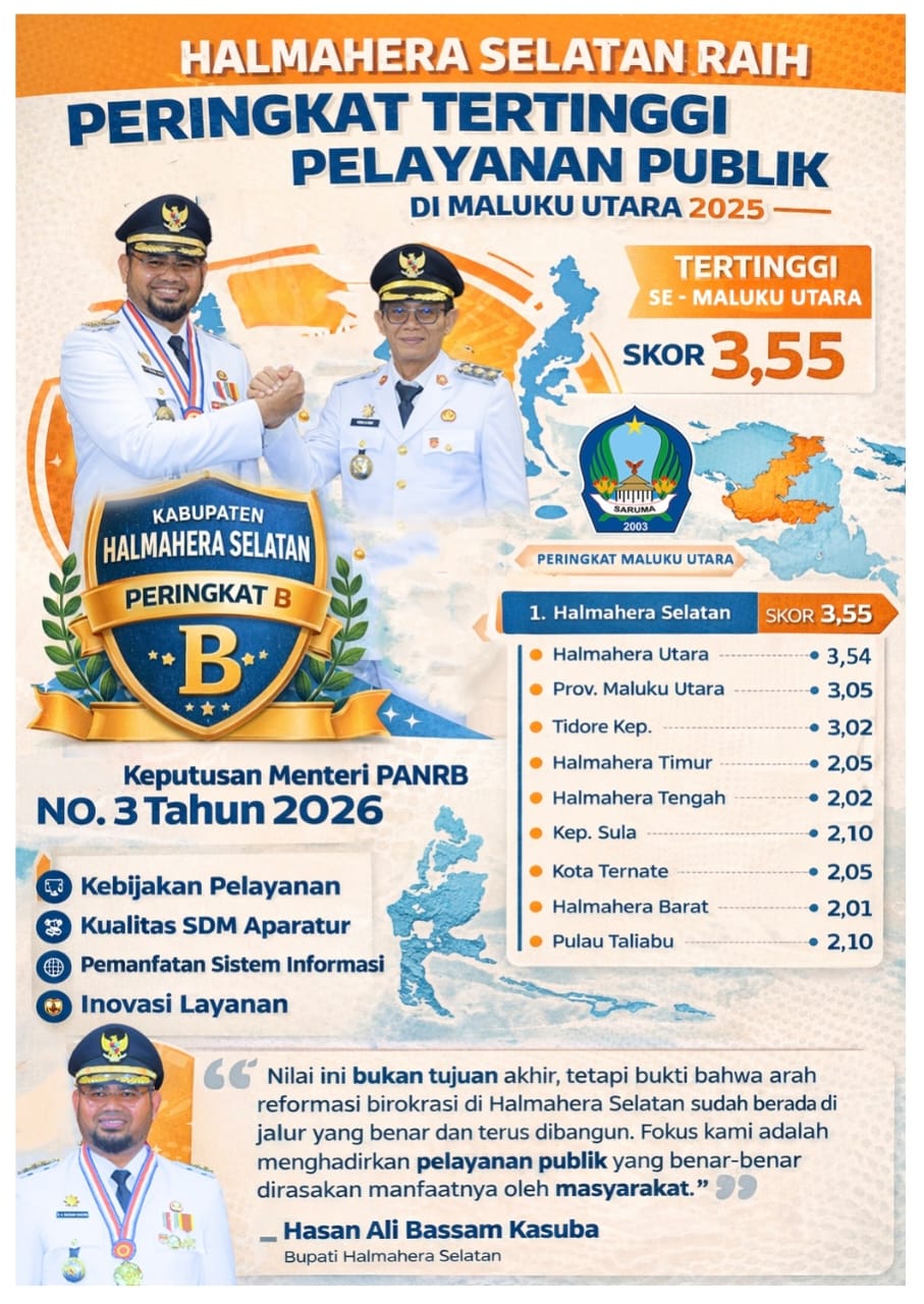 Capaian ini diumumkan secara resmi melalui Surat Keputusan MenPAN-RB Nomor 3 Tahun 2026, yang menempatkan Halmahera Selatan di posisi teratas dengan nilai 3.55 (kategori B). Disusul Kabupaten Halmahera Utara dengan nilai 3.54, dan Provinsi Maluku Utara di posisi ketiga dengan nilai 3.17.
