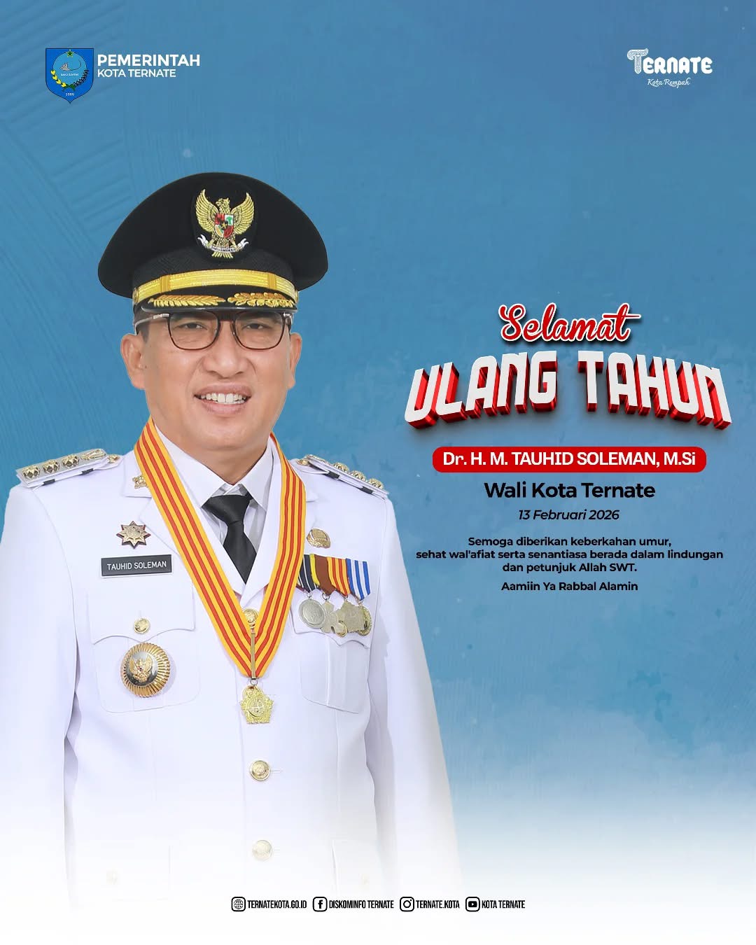 Ternate — Tanggal 13 Februari 2026 menjadi momen istimewa bagi Wali Kota Ternate, Dr. H.M. Tauhid Soleman, M.Si, yang genap berusia 56 tahun.Moment istimewa pemimpin pemerintah daerah dan rakyat Kita Ternate ini tidak dirayakan dengan meriah.Konon H.M.Tauhid Soleman memilih ulang tahunnya secara sederhana karena pertimbangan sanse of crisis atas kehidupan sebagian warganya.