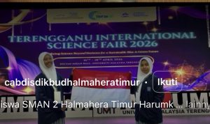 TERNATE — Dari ujung timur Indonesia, kabar membanggakan datang dari Malaysia. Dua siswi SMAN 2 Halmahera Timur, Wibi Hamidah dan Sitti Namira Said, sukses mengibarkan nama Maluku Utara di kancah dunia. Mereka menyabet Gold Award dan Best Poster pada Terengganu International Science Fair (TISF) 2026 di University Malaysia Terengganu, 16–20 April 2026.
